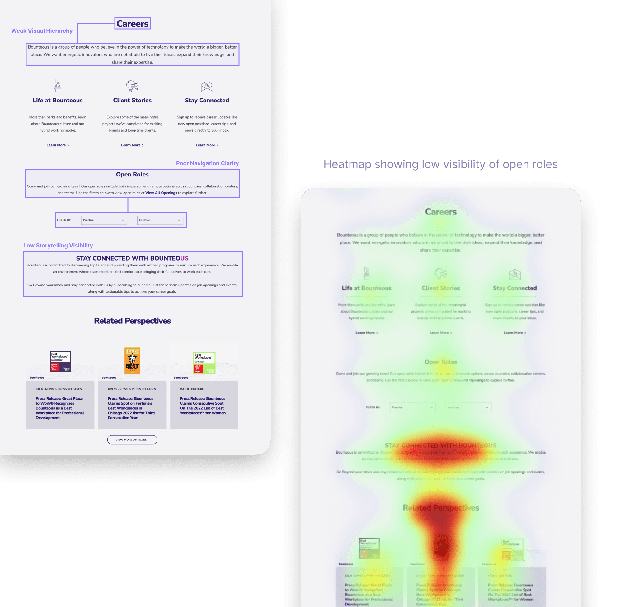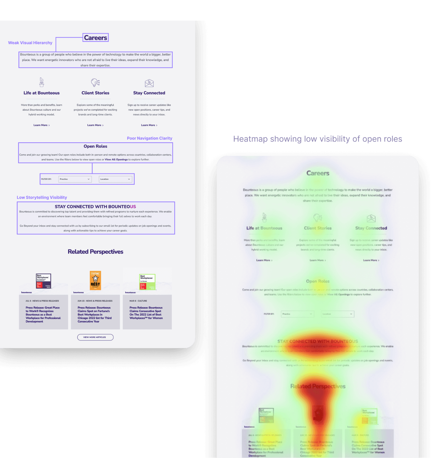 To understand why engagement was low, I ran a quick heuristic audit and predictive heatmap of the careers page. The results showed exactly where users were getting lost: