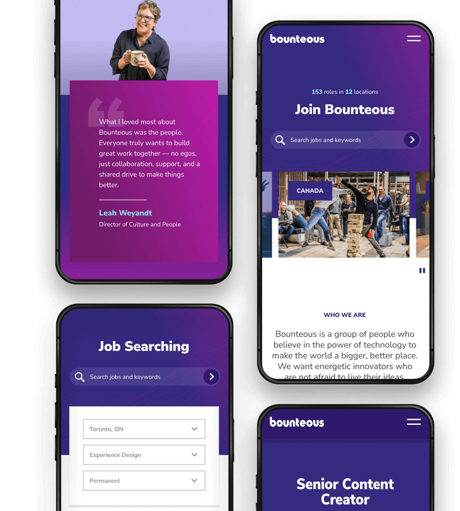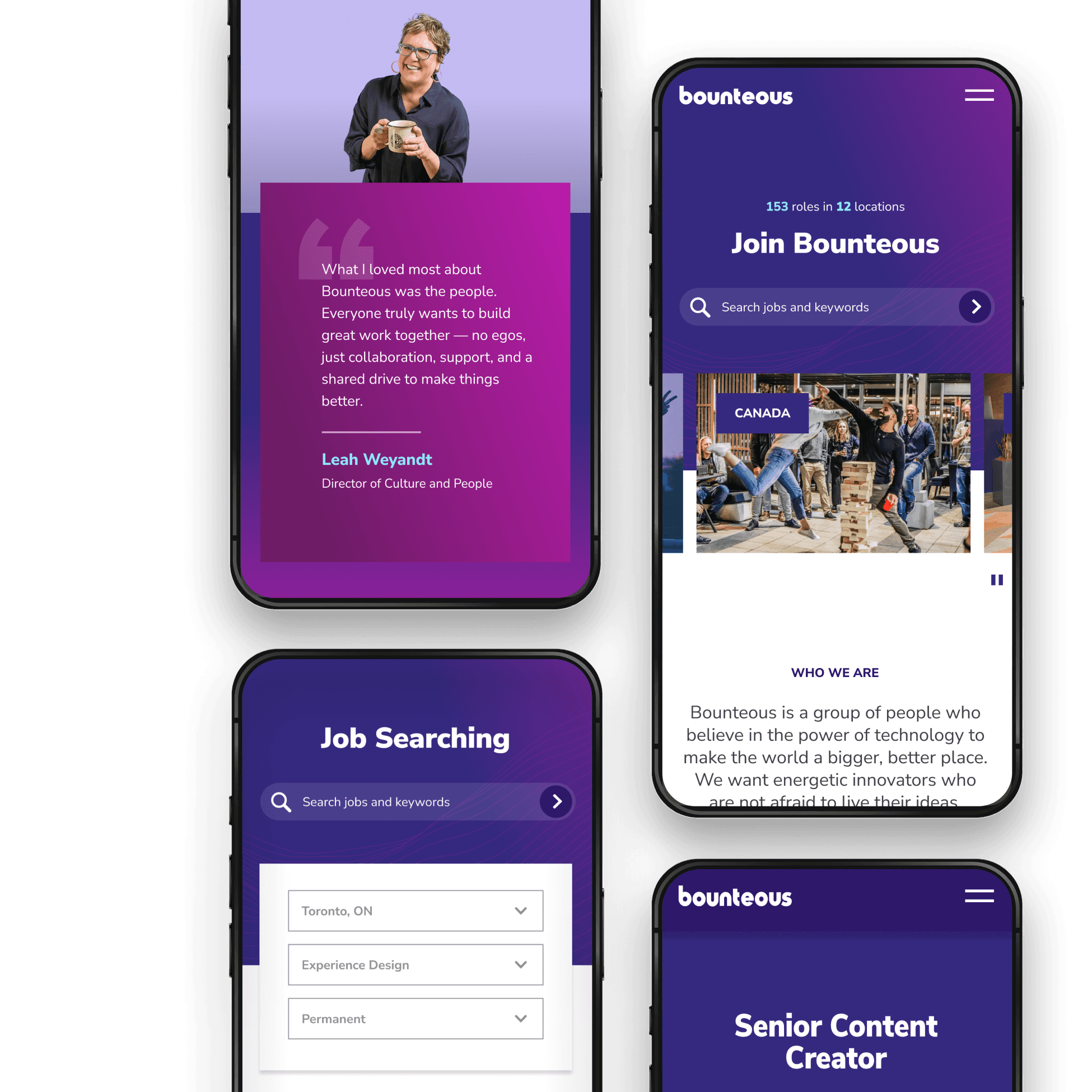 As the lead designer, I set out with the team to create a careers experience that balanced clarity with emotion — one that made it easy for candidates to find roles while also helping them understand who we are as a company. Together, we aimed to reveal the creativity, collaboration, and culture that define Bounteous, transforming a functional job board into an experience that inspired connection and belonging.